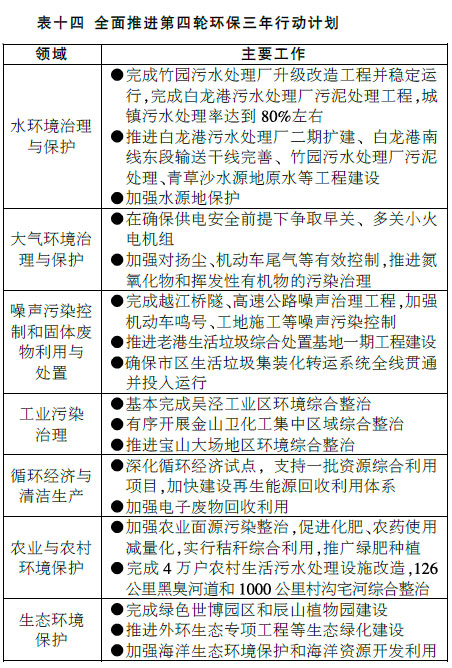 著力推進(jìn)電力工業(yè)“上大壓小”,加快推進(jìn)工業(yè)、建筑、交通、公共機構(gòu)、居民生活等重點領(lǐng)域節(jié)能改造工程。全面建成進(jìn)口液化天然氣一期和東海大橋海上風(fēng)電一期等工程,推廣使用清潔高效能源。聚焦水環(huán)境和大氣環(huán)境治理保護(hù)、循環(huán)經(jīng)濟與清潔生產(chǎn)等領(lǐng)域,加快實施第四輪環(huán)保三年行動計劃(見表十四)。加強長三角區(qū)域合作,深入推進(jìn)上海太湖流域水環(huán)境綜合治理工程。嚴(yán)格落實崇明現(xiàn)代化生態(tài)島建設(shè)綱要,啟動實施崇明生態(tài)島三年行動計劃。全力做好世博環(huán)保工作。堅決淘汰高污染、高能耗、高危險落后產(chǎn)能,爭取全年關(guān)停調(diào)整落后產(chǎn)能總量不低于上年水平。