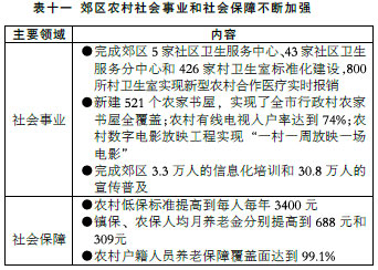 郊區(qū)農(nóng)村公共服務(wù)水平不斷提升。加強郊區(qū)農(nóng)村基礎(chǔ)設(shè)施建設(shè),新建改建農(nóng)村公路約500公里,完成118個村莊改造和2016戶低收入農(nóng)戶危舊房改造。繼續(xù)推進(jìn)“清潔家園”工程,完成村溝宅河綜合整治2012公里、農(nóng)村生活污水處理設(shè)施改造2.2萬多戶。繼續(xù)加大社會資源配置向郊區(qū)農(nóng)村傾斜的力度,郊區(qū)農(nóng)村社會事業(yè)和社會保障不斷加強(見表十一)。