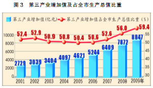 服務(wù)業(yè)支撐作用不斷增強。全年第三產(chǎn)業(yè)增加值占全市生產(chǎn)總值比重達(dá)到59.4%,比上年提高3.4個百分點(見圖3)。金融、房地產(chǎn)增加值均增長25%以上,軟件和信息服務(wù)業(yè)經(jīng)營收入增速超過20%。生產(chǎn)性服務(wù)業(yè)、文化創(chuàng)意產(chǎn)業(yè)等新興產(chǎn)業(yè)快速發(fā)展,現(xiàn)代服務(wù)業(yè)集聚區(qū)、生產(chǎn)性服務(wù)業(yè)功能區(qū)和服務(wù)外包示范區(qū)建設(shè)加快推進(jìn)。上海迪士尼項目獲國家批準(zhǔn)。