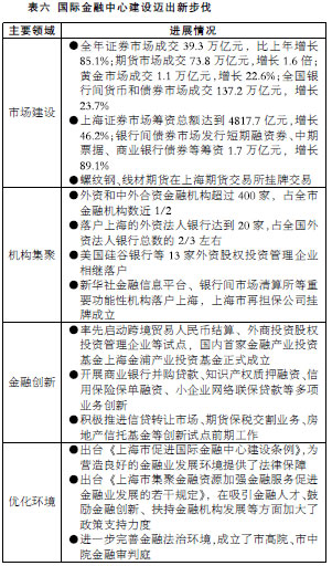 國際金融中心建設(shè)邁出新步伐。制定出臺上海貫徹落實國務(wù)院《關(guān)于推進(jìn)上海加快發(fā)展現(xiàn)代服務(wù)業(yè)和先進(jìn)制造業(yè)建設(shè)國際金融中心和國際航運中心意見》的實施意見,明確了推進(jìn)國際金融中心建設(shè)93項重點工作和國際航運中心建設(shè)59項重點工作。金融市場建設(shè)、機構(gòu)集聚、金融創(chuàng)新和環(huán)境建設(shè)邁出新步伐(見表六)。全年金融市場交易總額(不含外匯市場)累計達(dá)到251萬億元,比上年增長41.7%;全市金融機構(gòu)累計超過850家。