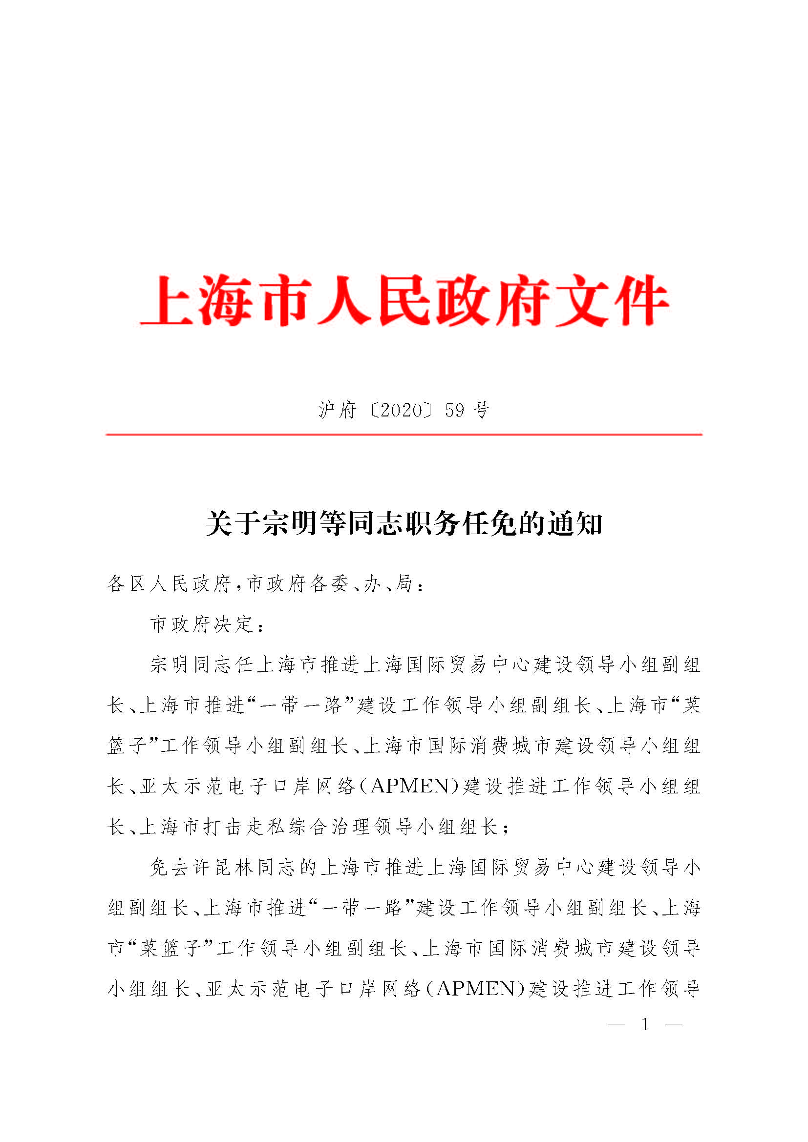 宗明同志任上海市推進(jìn)上海國(guó)際貿(mào)易中心建設(shè)領(lǐng)導(dǎo)小組副組長(zhǎng)、上海市推進(jìn)“一帶一路”建設(shè)工作領(lǐng)導(dǎo)小組副組長(zhǎng)、上海市“菜籃子”工作領(lǐng)導(dǎo)小組副組長(zhǎng)、上海市國(guó)際消費(fèi)城市建設(shè)領(lǐng)導(dǎo)小組組長(zhǎng)、亞太示范電子口岸網(wǎng)絡(luò)(APMEN)建設(shè)推進(jìn)工作領(lǐng)導(dǎo)小組組長(zhǎng)、上海市打擊走私綜合治理領(lǐng)導(dǎo)小組組長(zhǎng);