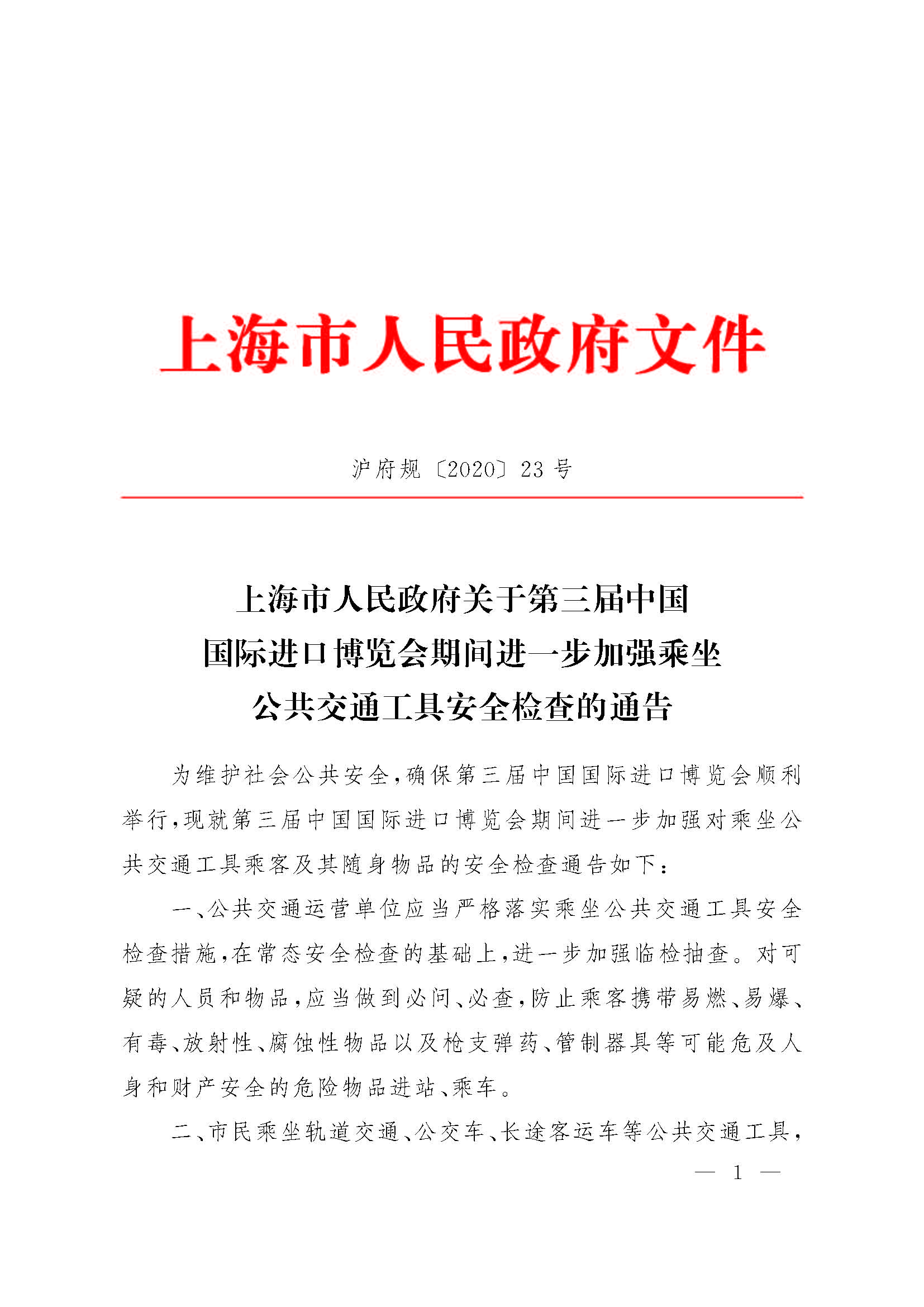 上海市人民政府關(guān)于第三屆中國(guó)國(guó)際進(jìn)口博覽會(huì)期間進(jìn)一步加強(qiáng)乘坐公共交通工具安全檢查的通告