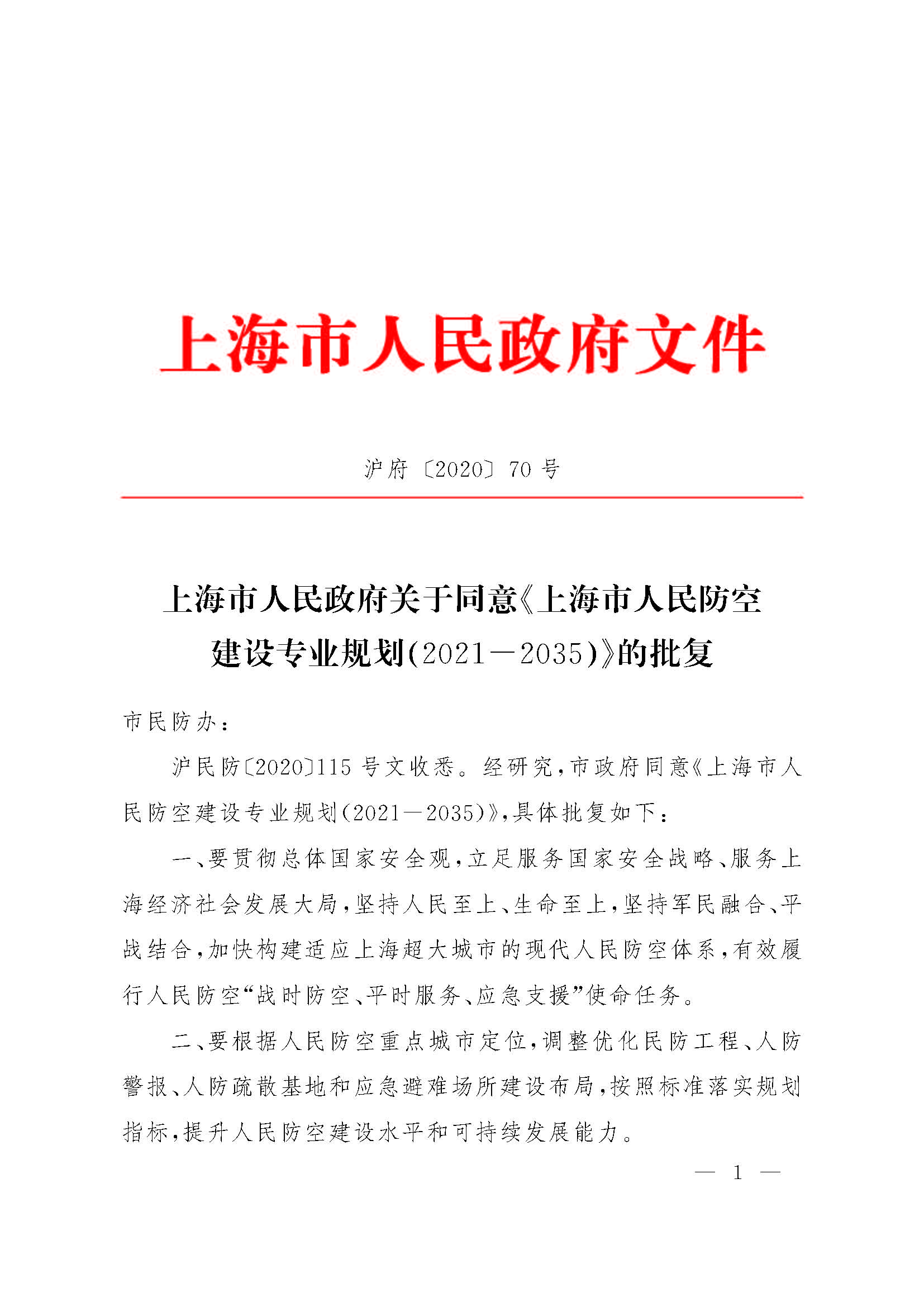 ??滬民防〔2020〕115號文收悉。經(jīng)研究,市政府同意《上海市人民防空建設(shè)專業(yè)規(guī)劃(2021-2035)》,具體批復(fù)如下: