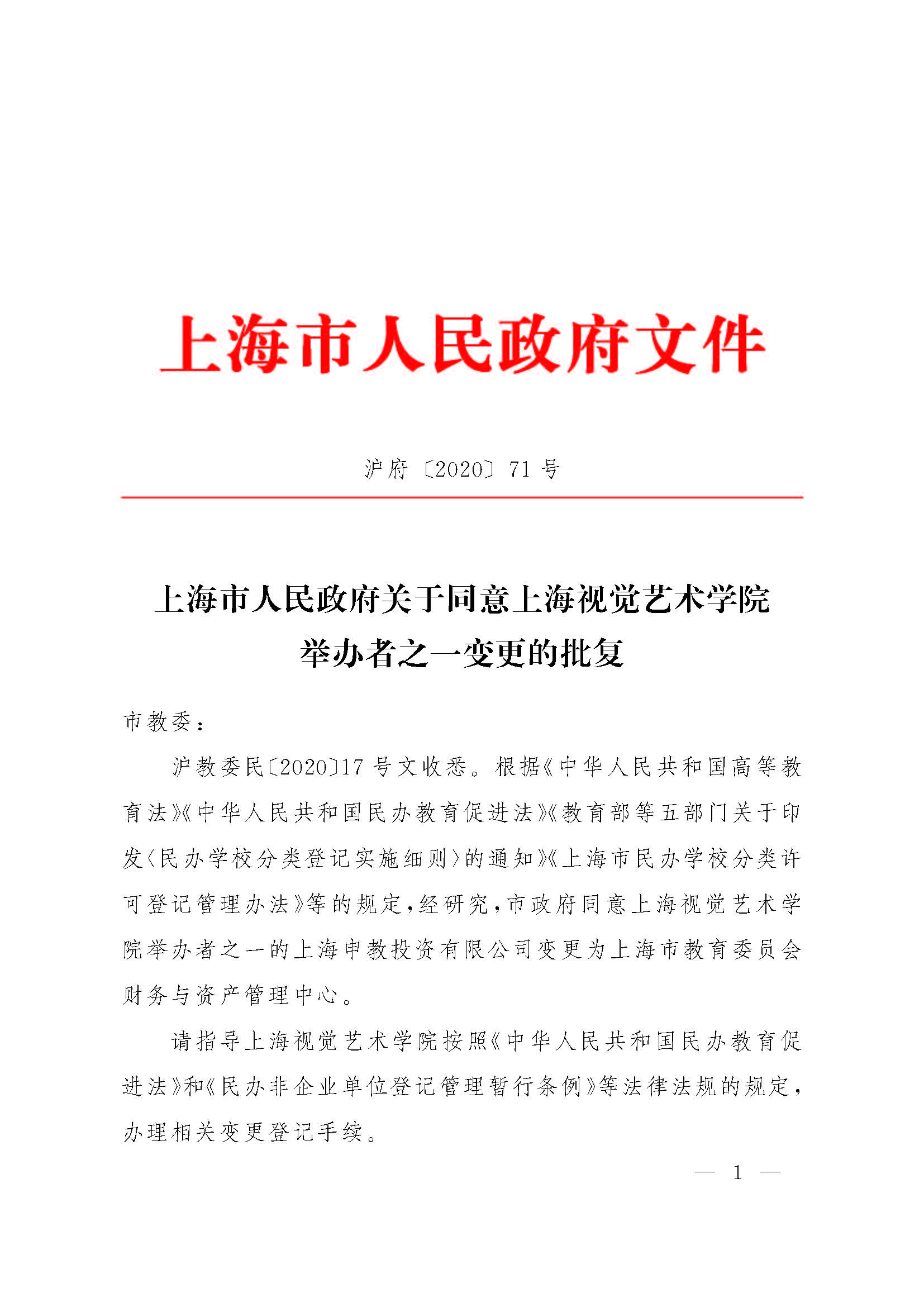 ??滬教委民〔2020〕17號文收悉。根據(jù)《中華人民共和國高等教育法》《中華人民共和國民辦教育促進法》《教育部等五部門關(guān)于印發(fā)〈民辦學(xué)校分類登記實施細則〉的通知》《上海市民辦學(xué)校分類許可登記管理辦法》等的規(guī)定,經(jīng)研究,市政府同意上海視覺藝術(shù)學(xué)院舉辦者之一的上海申教投資有限公司變更為上海市教育委員會財務(wù)與資產(chǎn)管理中心。
