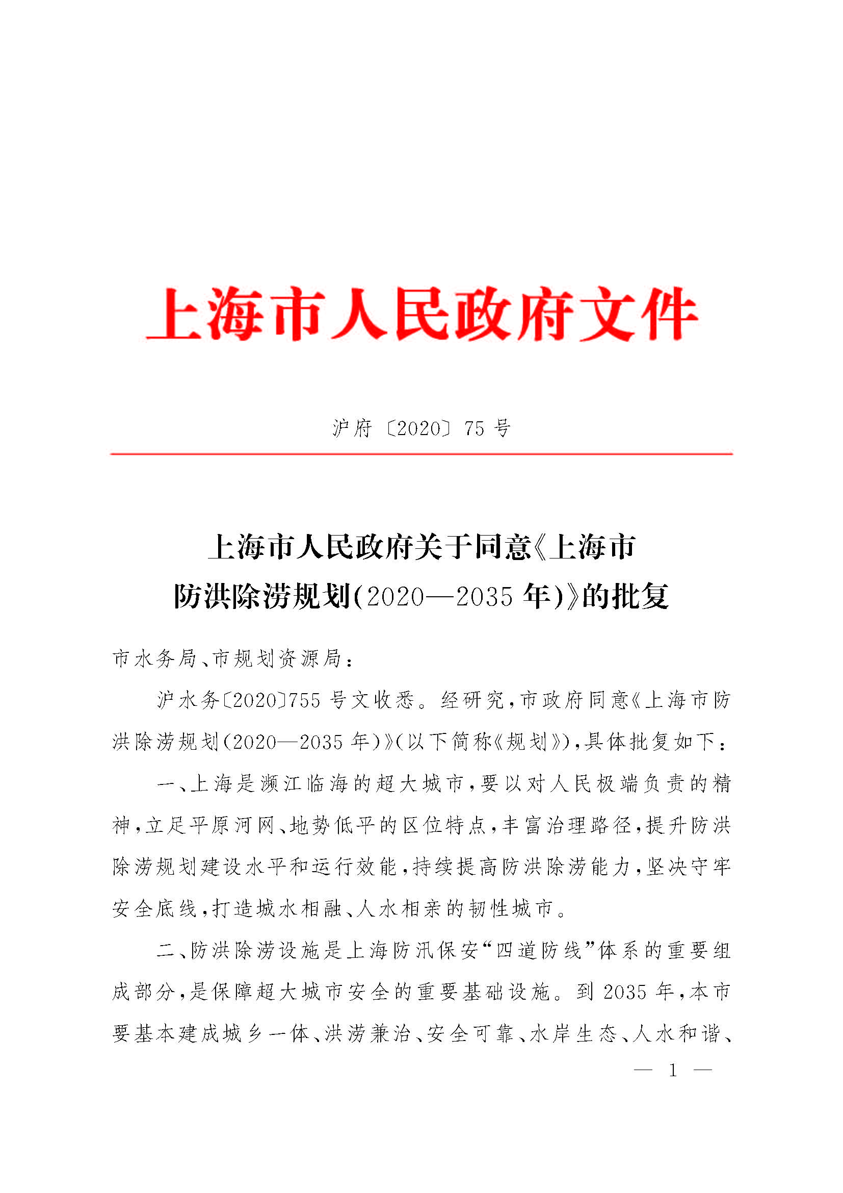 ??滬水務(wù)〔2020〕755號(hào)文收悉。經(jīng)研究,市政府同意《上海市防洪除澇規(guī)劃(2020—2035年)》(以下簡(jiǎn)稱《規(guī)劃》),具體批復(fù)如下: