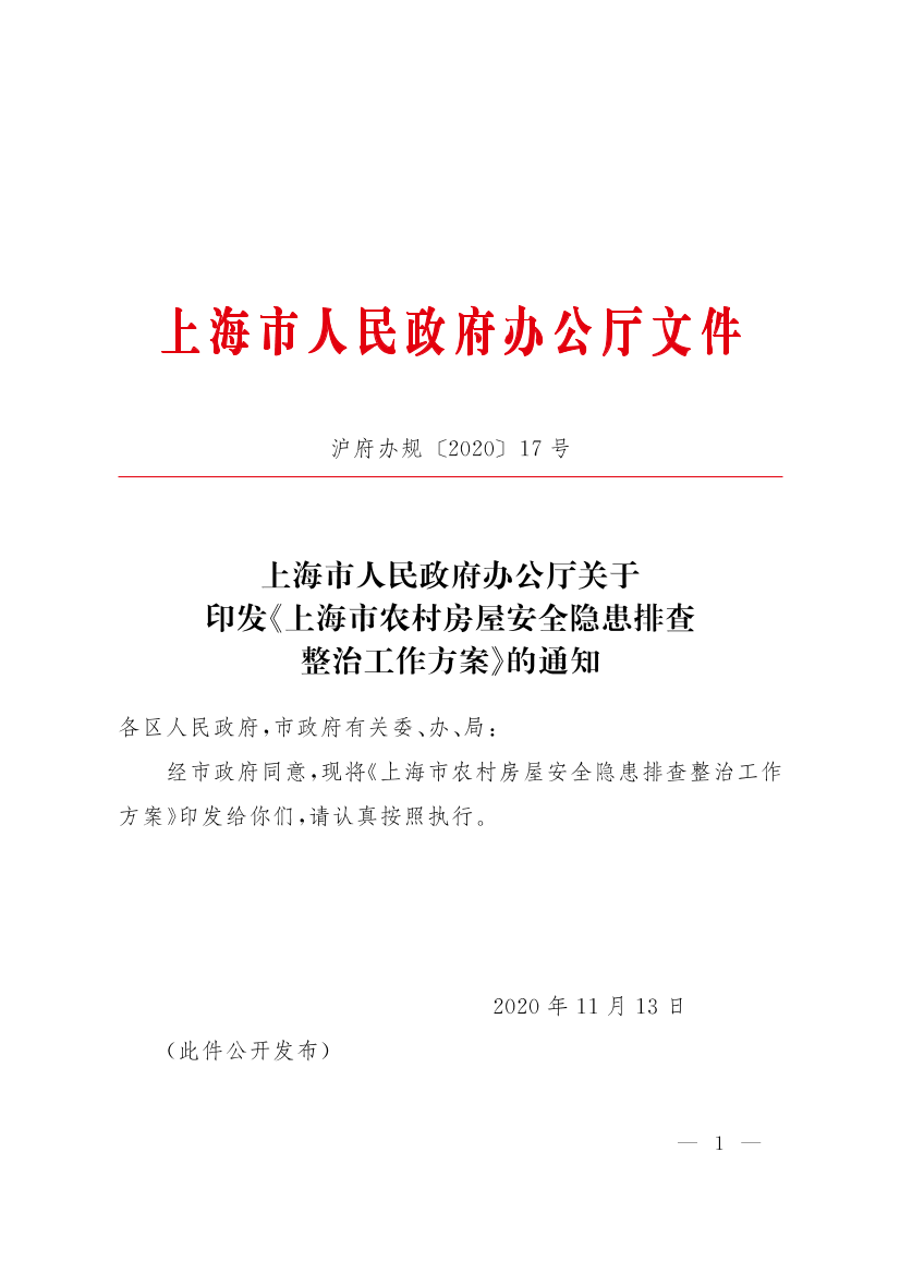 上海市人民政府辦公廳關(guān)于印發(fā)《上海市農(nóng)村房屋安全隱患排查整治工作方案》的通知