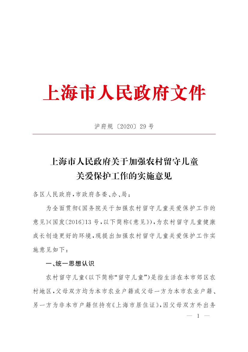 上海市人民政府關(guān)于加強(qiáng)農(nóng)村留守兒童關(guān)愛(ài)保護(hù)工作的實(shí)施意見(jiàn)