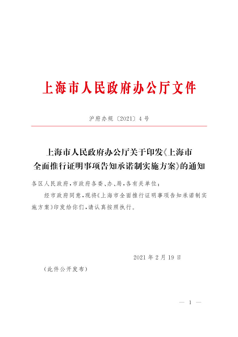 上海市人民政府辦公廳關(guān)于印發(fā)《上海市全面推行證明事項(xiàng)告知承諾制實(shí)施方案》的通知