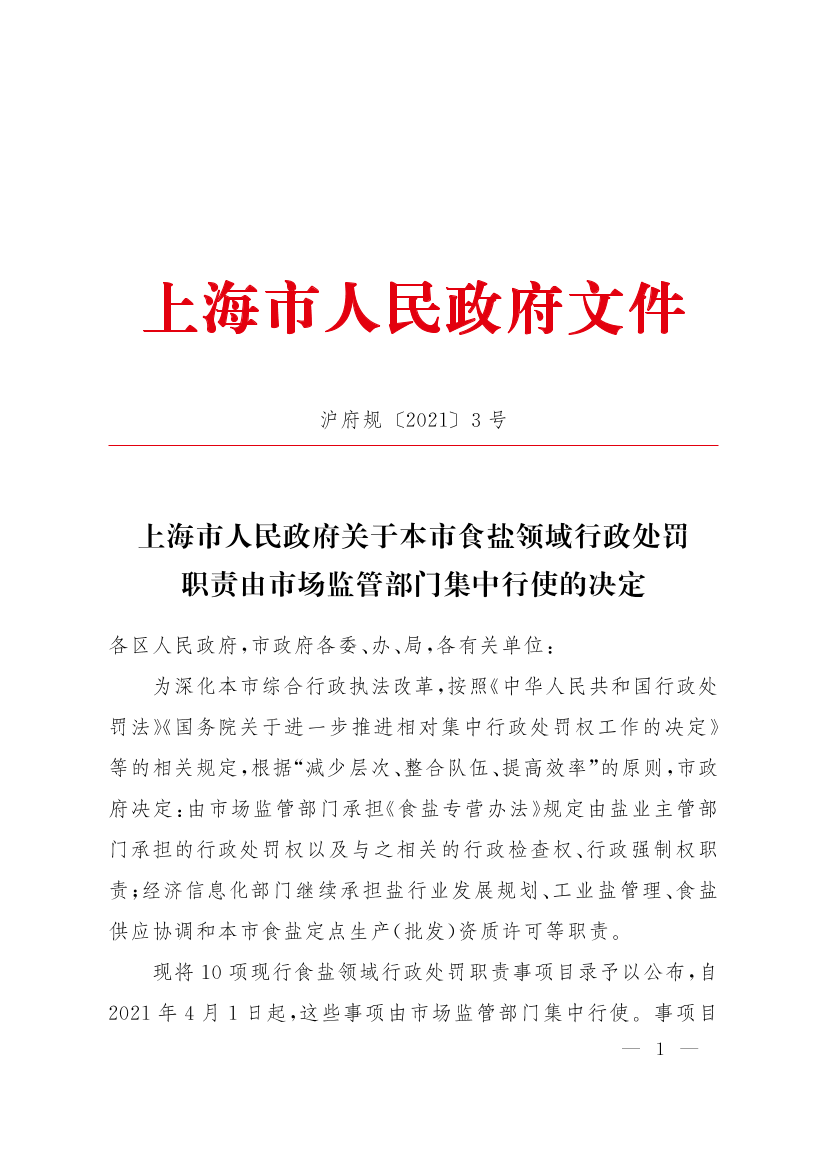 上海市人民政府關(guān)于本市食鹽領域行政處罰職責由市場監(jiān)管部門集中行使的決定