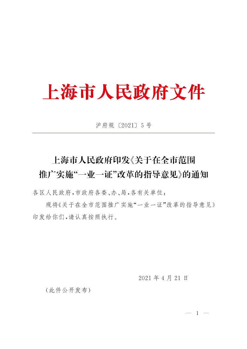 上海市人民政府印發(fā)《關(guān)于在全市范圍推廣實施“一業(yè)一證”改革的指導(dǎo)意見》的通知