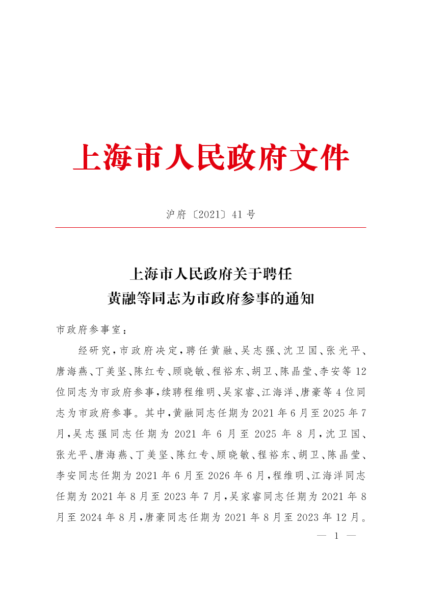 上海市人民政府關(guān)于聘任黃融等同志為市政府參事的通知