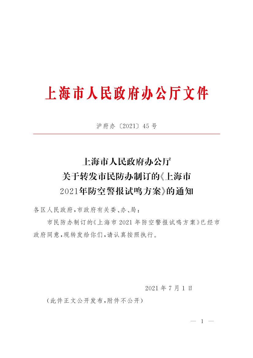 ??市民防辦制訂的《上海市2021年防空警報試鳴方案》已經(jīng)市政府同意,現(xiàn)轉(zhuǎn)發(fā)給你們,請認真按照執(zhí)行。