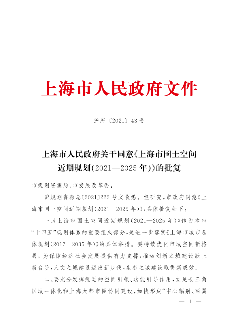 ??滬規(guī)劃資源總〔2021〕222號(hào)文收悉。經(jīng)研究,市政府同意《上海市國(guó)土空間近期規(guī)劃(2021—2025年)》,具體批復(fù)如下: