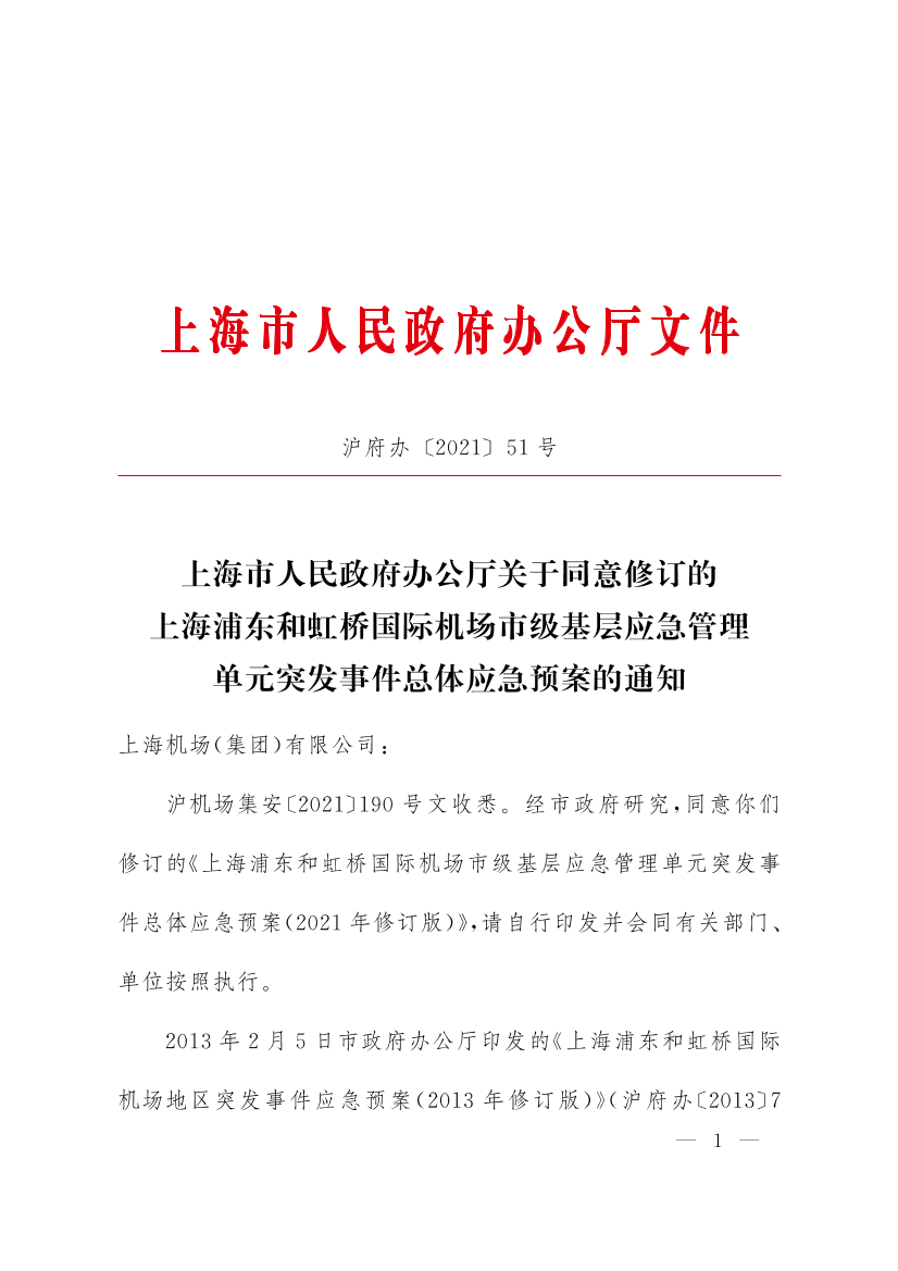 ??滬機(jī)場集安〔2021〕190號文收悉。經(jīng)市政府研究,同意你們修訂的《上海浦東和虹橋國際機(jī)場市級基層應(yīng)急管理單元突發(fā)事件總體應(yīng)急預(yù)案(2021年修訂版)》,請自行印發(fā)并會同有關(guān)部門、單位按照執(zhí)行。