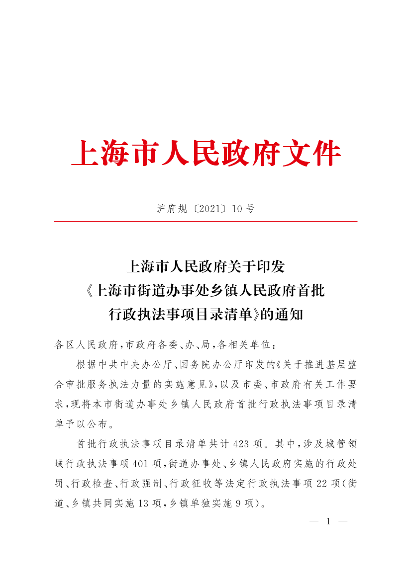 上海市人民政府關于印發(fā)《上海市街道辦事處鄉(xiāng)鎮(zhèn)人民政府首批行政執(zhí)法事項目錄清單》的通知