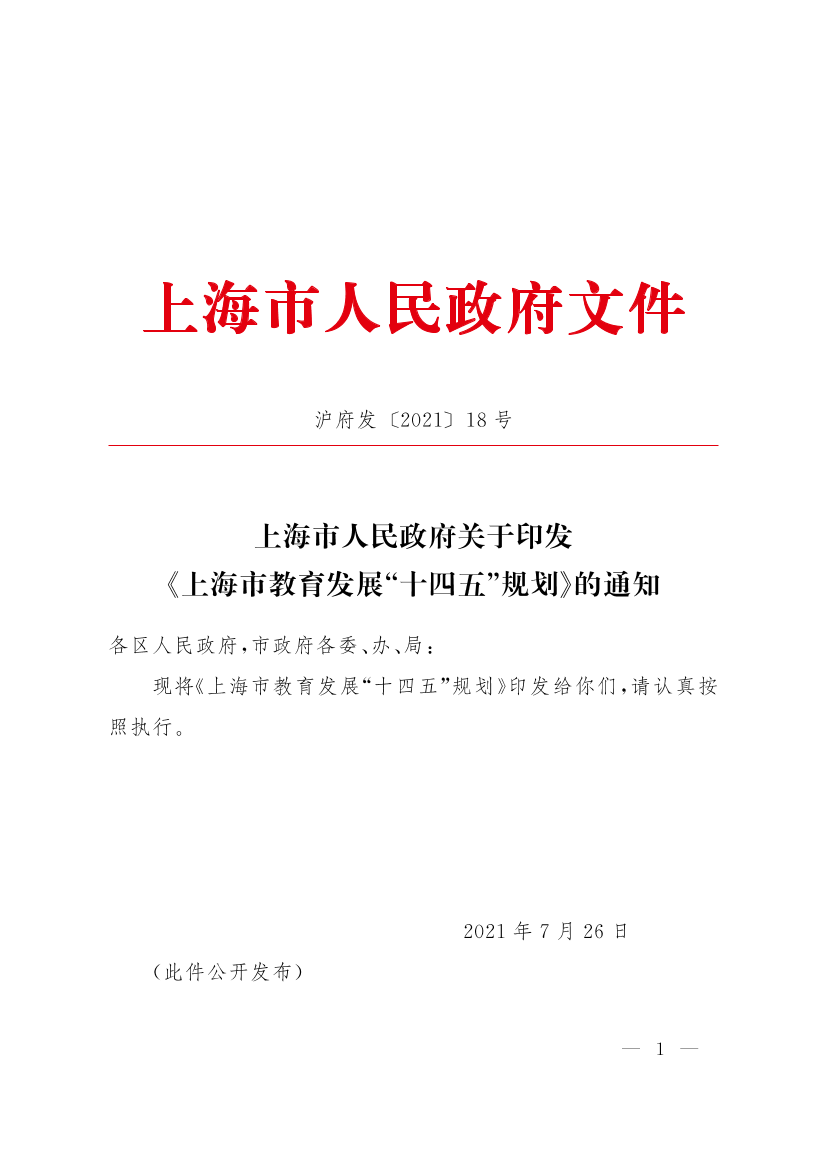 ??現(xiàn)將《上海市教育發(fā)展“十四五”規(guī)劃》印發(fā)給你們,請認真按照執(zhí)行。