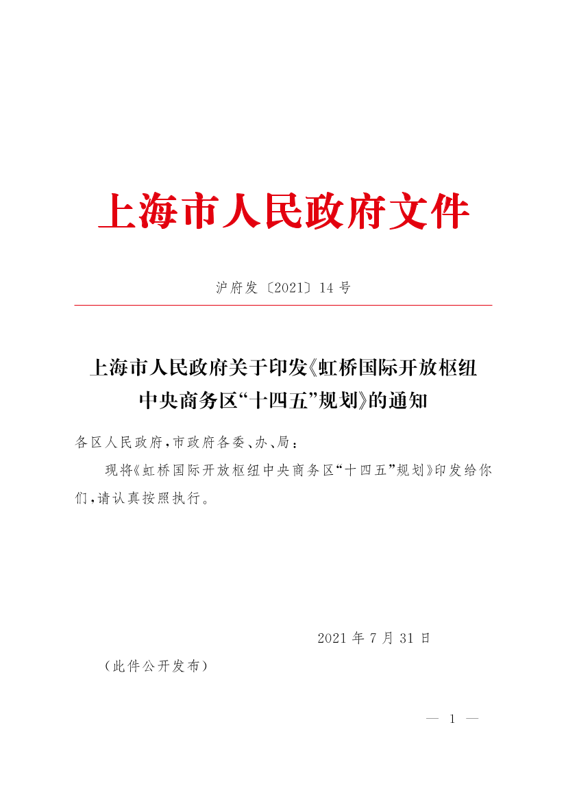 上海市人民政府關(guān)于印發(fā)《虹橋國際開放樞紐中央商務區(qū)“十四五”規(guī)劃》的通知