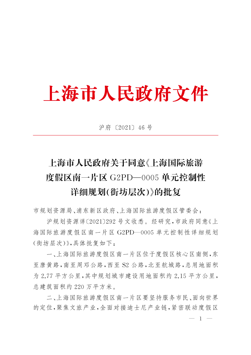 ??滬規(guī)劃資源詳〔2021〕292號文收悉。經(jīng)研究,市政府同意《上海國際旅游度假區(qū)南一片區(qū)G2PD—0005單元控制性詳細規(guī)劃(街坊層次)》,具體批復如下: