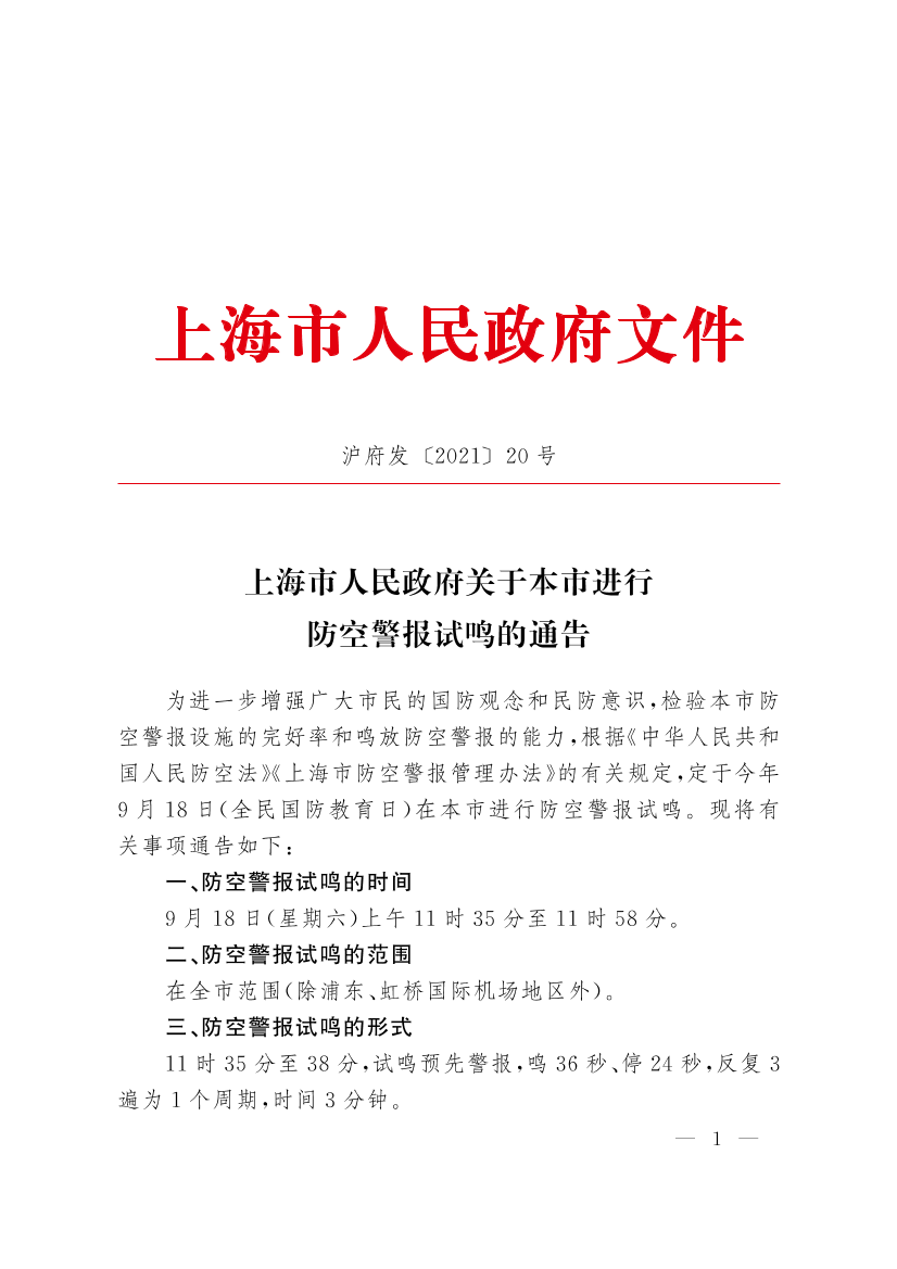 ??為進(jìn)一步增強(qiáng)廣大市民的國(guó)防觀念和民防意識(shí),檢驗(yàn)本市防空警報(bào)設(shè)施的完好率和鳴放防空警報(bào)的能力,根據(jù)《中華人民共和國(guó)人民防空法》《上海市防空警報(bào)管理辦法》的有關(guān)規(guī)定,定于今年9月18日(全民國(guó)防教育日)在本市進(jìn)行防空警報(bào)試?guó)Q?,F(xiàn)將有關(guān)事項(xiàng)通告如下: