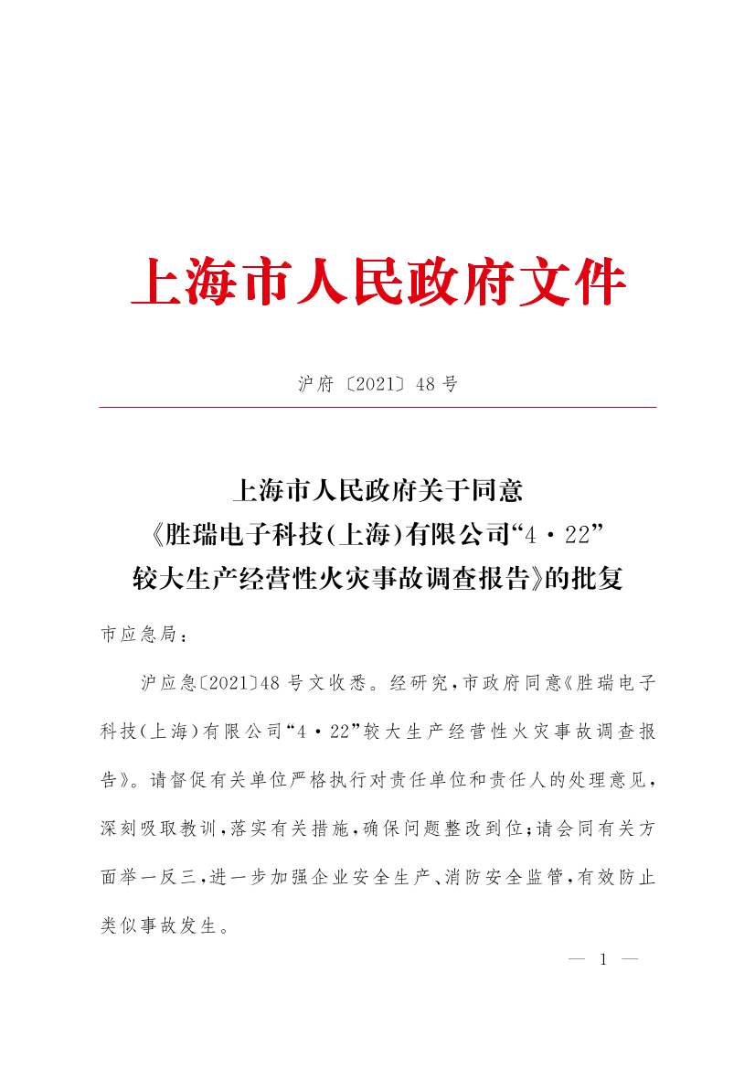 ??滬應(yīng)急〔2021〕48號文收悉。經(jīng)研究,市政府同意《勝瑞電子科技(上海)有限公司“4·22”較大生產(chǎn)經(jīng)營性火災(zāi)事故調(diào)查報(bào)告》。請督促有關(guān)單位嚴(yán)格執(zhí)行對責(zé)任單位和責(zé)任人的處理意見,深刻吸取教訓(xùn),落實(shí)有關(guān)措施,確保問題整改到位;請會同有關(guān)方面舉一反三,進(jìn)一步加強(qiáng)企業(yè)安全生產(chǎn)、消防安全監(jiān)管,有效防止類似事故發(fā)生。