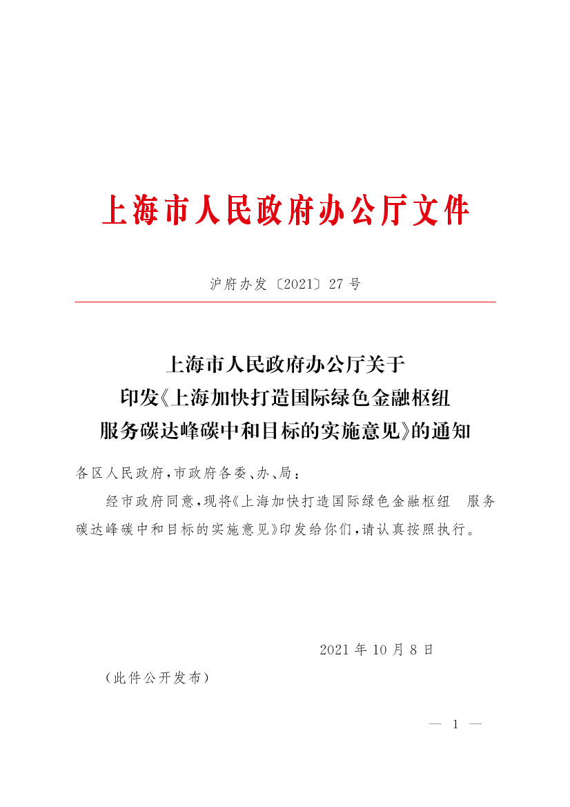 ??經(jīng)市政府同意,現(xiàn)將《上海加快打造國際綠色金融樞紐服務(wù)碳達峰碳中和目標的實施意見》印發(fā)給你們,請認真按照執(zhí)行。