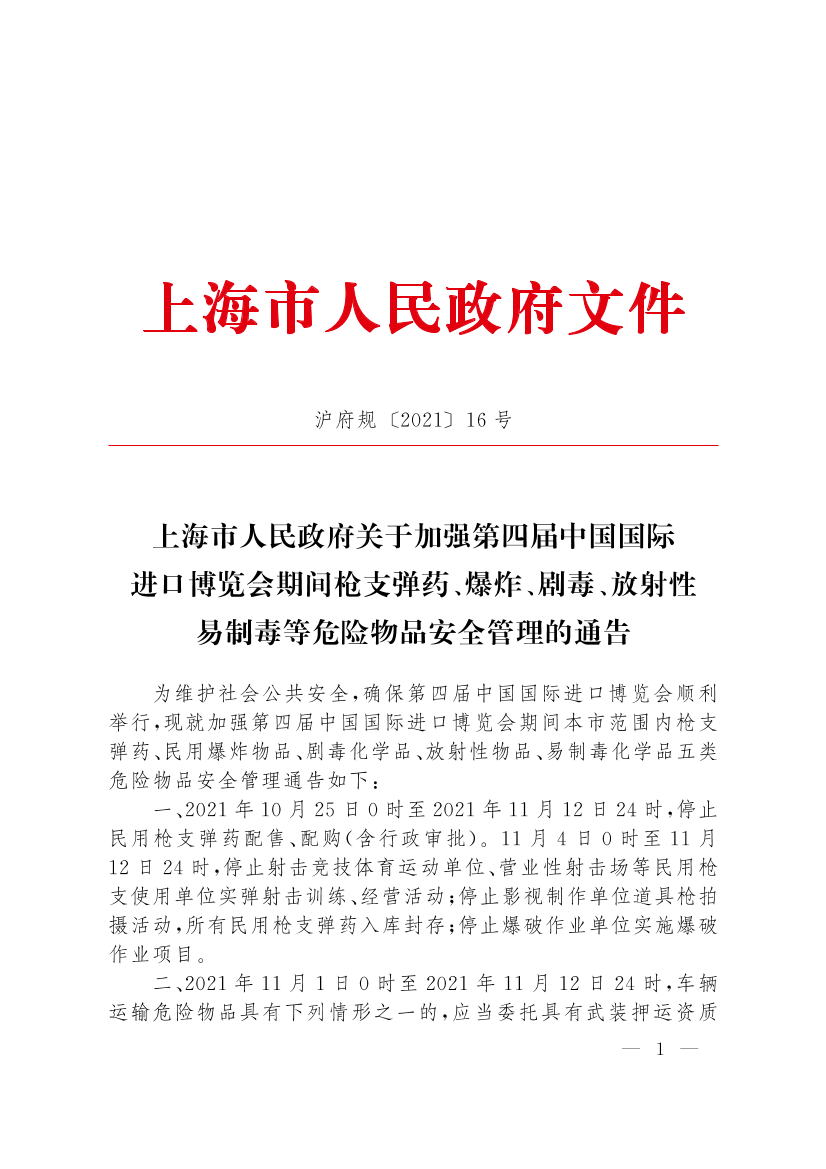 上海市人民政府關(guān)于加強(qiáng)第四屆中國(guó)國(guó)際進(jìn)口博覽會(huì)期間槍支彈藥、爆炸、劇毒、放射性易制毒等危險(xiǎn)物品安全管理的通告