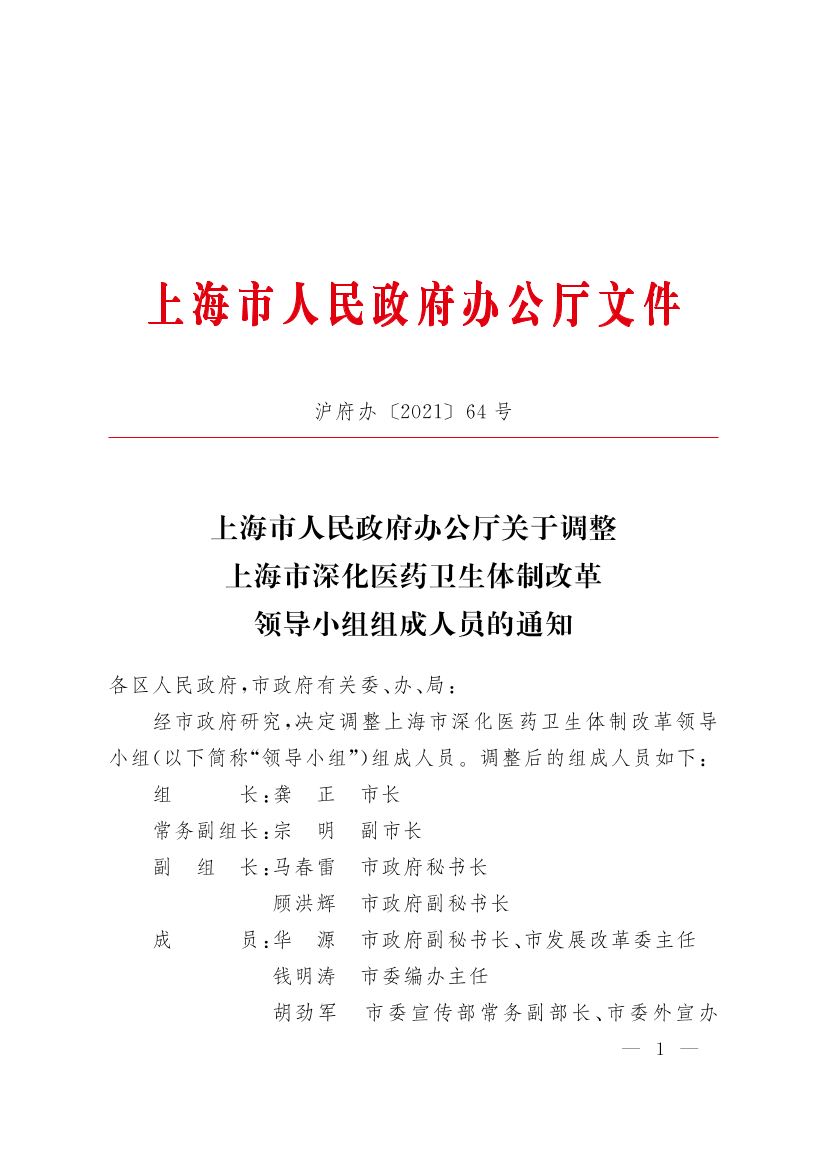 上海市人民政府辦公廳關(guān)于調(diào)整上海市深化醫(yī)藥衛(wèi)生體制改革領(lǐng)導(dǎo)小組組成人員的通知