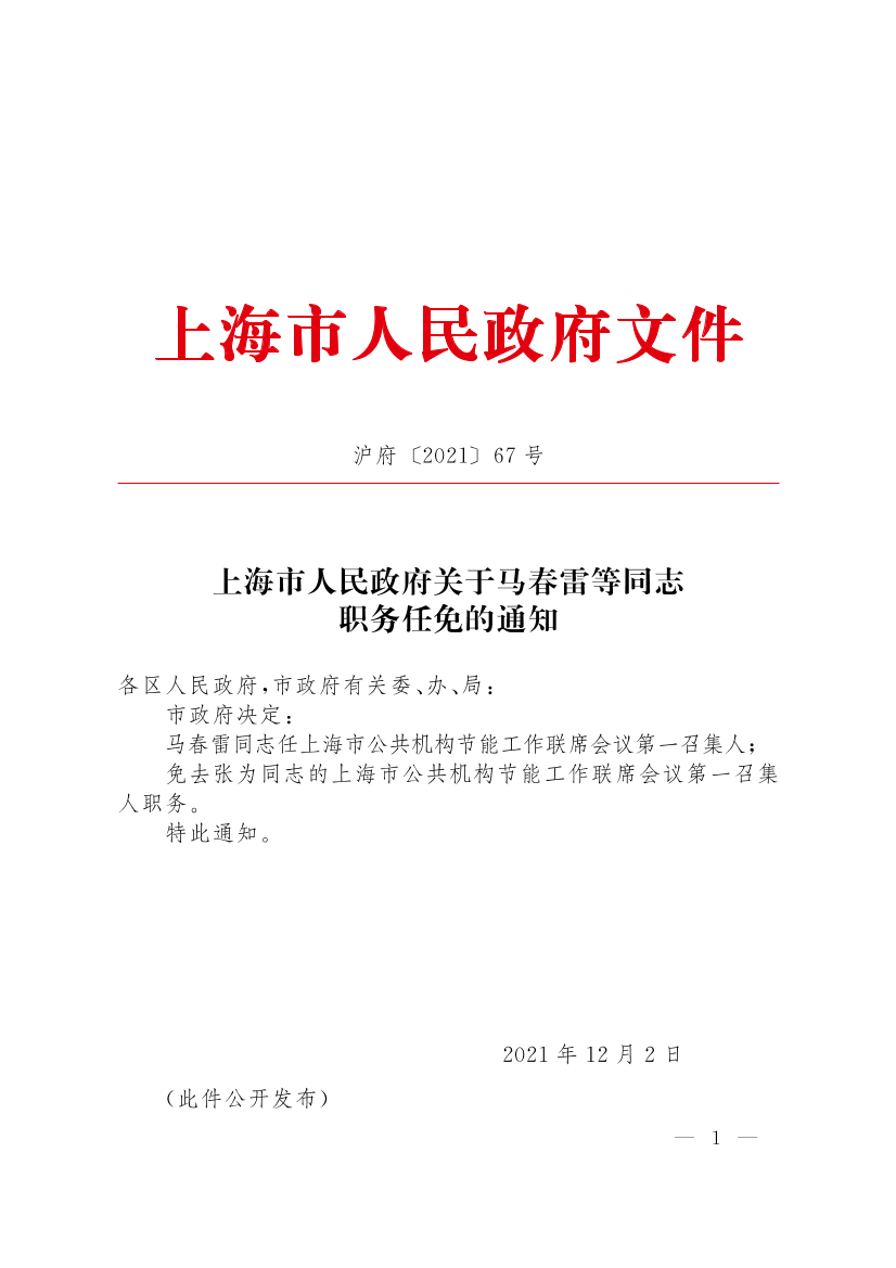 上海市人民政府關(guān)于馬春雷等同志職務(wù)任免的通知