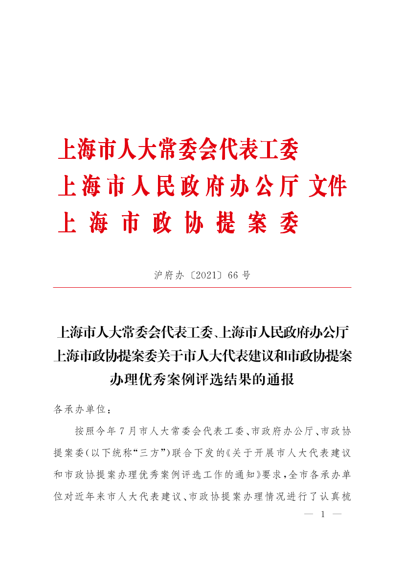 上海市人大常委會代表工委、上海市人民政府辦公廳、上海市政協(xié)提案委關(guān)于市人大代表建議和市政協(xié)提案辦理優(yōu)秀案例評選結(jié)果的通報