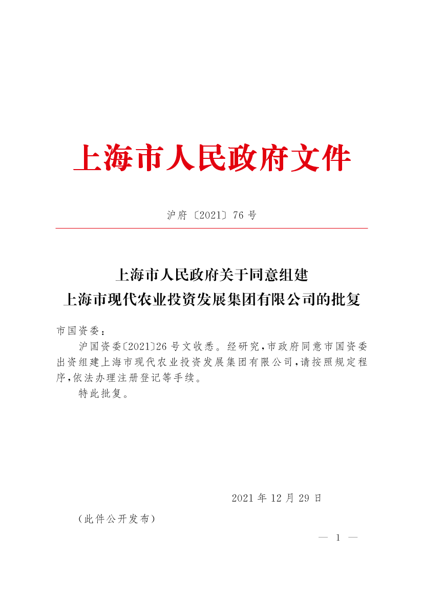 ??滬國資委〔2021〕26號文收悉。經(jīng)研究,市政府同意市國資委出資組建上海市現(xiàn)代農業(yè)投資發(fā)展集團有限公司,請按照規(guī)定程序,依法辦理注冊登記等手續(xù)。