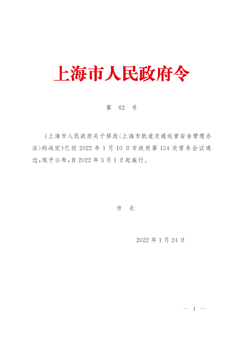 ??《上海市人民政府關(guān)于修改〈上海市軌道交通運營安全管理辦法〉的決定》已經(jīng)2022年1月10日市政府第154次常務(wù)會議通過,現(xiàn)予公布,自2022年3月1日起施行。
