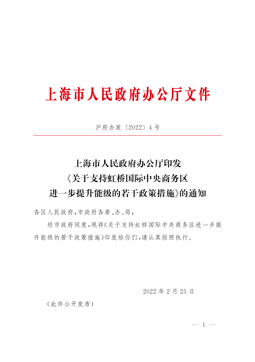 上海市人民政府辦公廳印發(fā)《關(guān)于支持虹橋國際中央商務(wù)區(qū)進(jìn)一步提升能級的若干政策措施》的通知