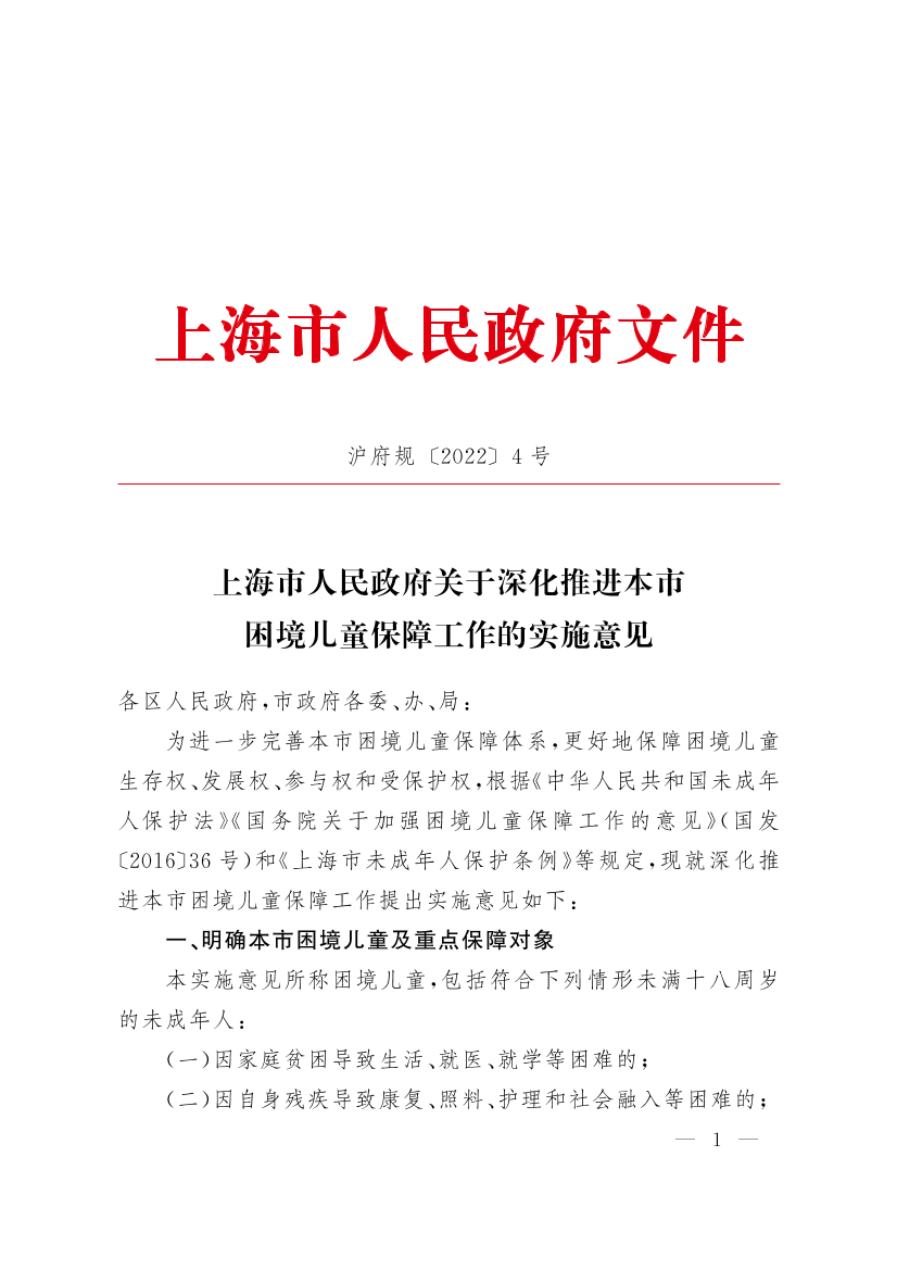 上海市人民政府關(guān)于深化推進(jìn)本市困境兒童保障工作的實(shí)施意見