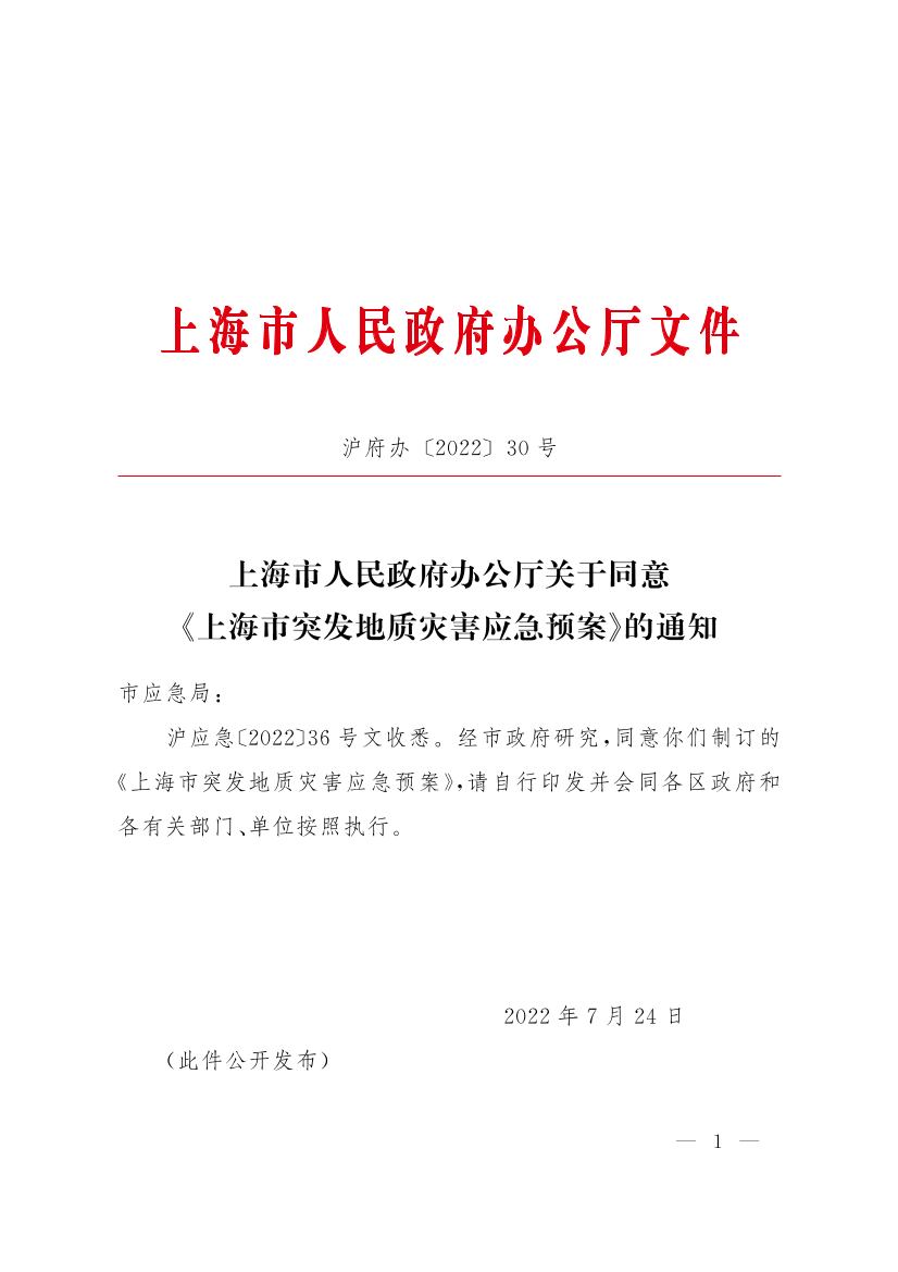 ??滬應(yīng)急〔2022〕36號(hào)文收悉。經(jīng)市政府研究,同意你們制訂的《上海市突發(fā)地質(zhì)災(zāi)害應(yīng)急預(yù)案》,請(qǐng)自行印發(fā)并會(huì)同各區(qū)政府和各有關(guān)部門、單位按照?qǐng)?zhí)行。