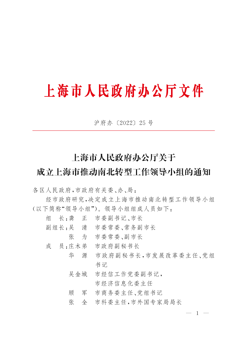 上海市人民政府辦公廳關(guān)于成立上海市推動(dòng)南北轉(zhuǎn)型工作領(lǐng)導(dǎo)小組的通知