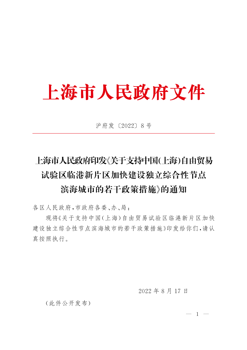 上海市人民政府印發(fā)《關(guān)于支持中國(guó)(上海)自由貿(mào)易試驗(yàn)區(qū)臨港新片區(qū)加快建設(shè)獨(dú)立綜合性節(jié)點(diǎn)濱海城市的若干政策措施》的通知