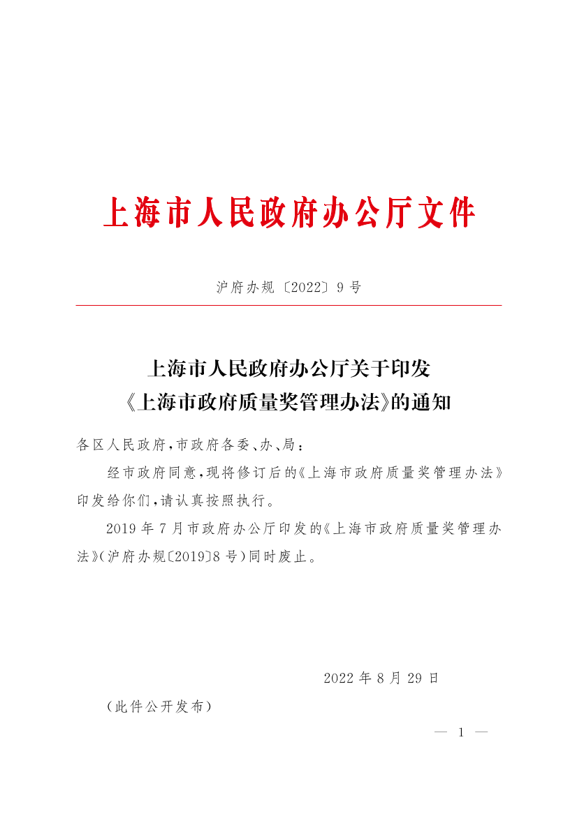 上海市人民政府辦公廳關(guān)于印發(fā)《上海市政府質(zhì)量獎管理辦法》的通知