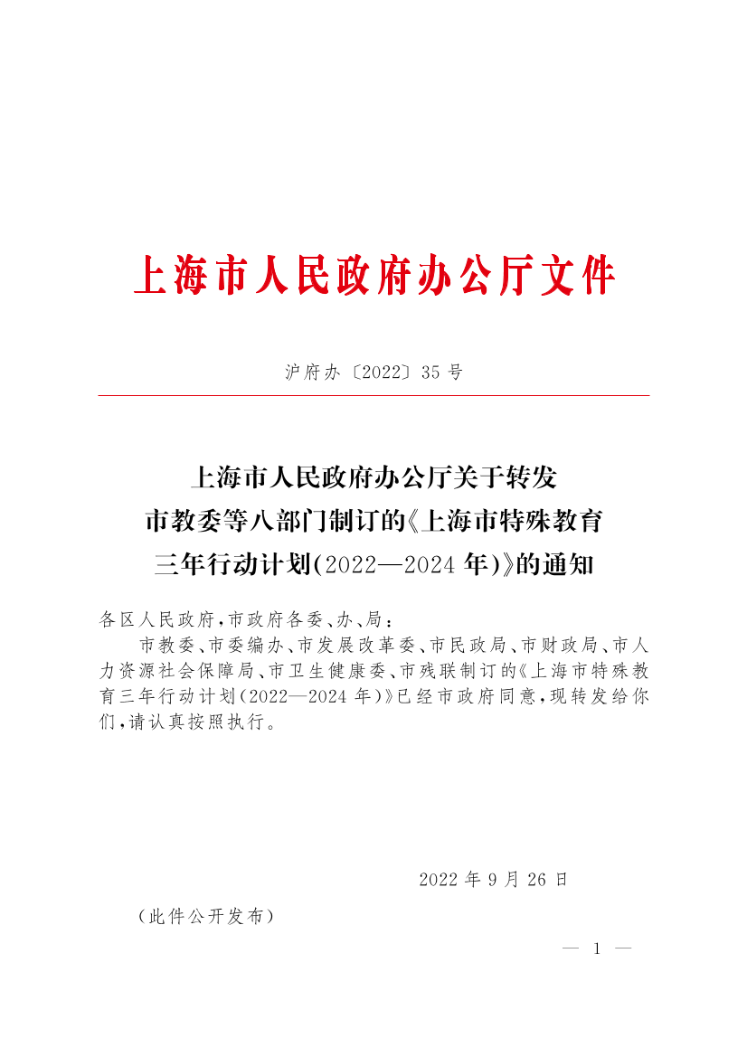 ??市教委、市委編辦、市發(fā)展改革委、市民政局、市財(cái)政局、市人力資源社會保障局、市衛(wèi)生健康委、市殘聯(lián)制訂的《上海市特殊教育三年行動計(jì)劃(2022—2024年)》已經(jīng)市政府同意,現(xiàn)轉(zhuǎn)發(fā)給你們,請認(rèn)真按照執(zhí)行。