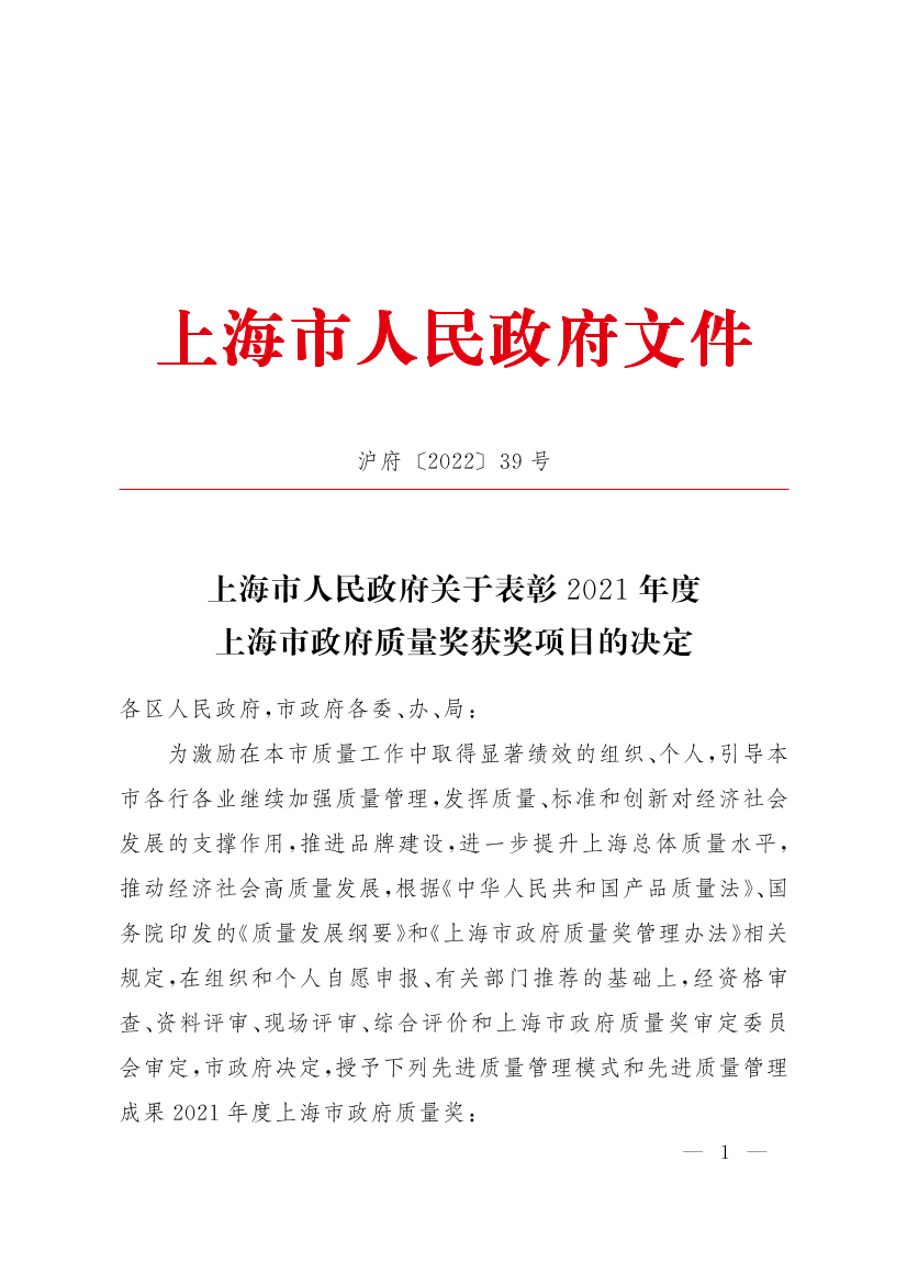 上海市人民政府關(guān)于表彰2021年度上海市政府質(zhì)量獎(jiǎng)獲獎(jiǎng)項(xiàng)目的決定