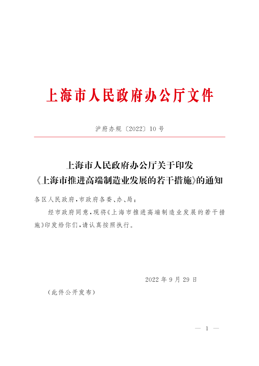 上海市人民政府辦公廳關于印發(fā)《上海市推進高端制造業(yè)發(fā)展的若干措施》的通知