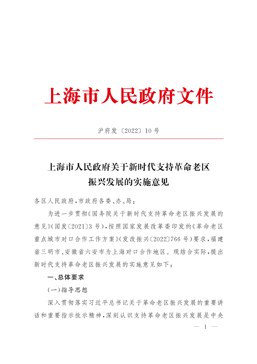 ??為進一步貫徹《國務(wù)院關(guān)于新時代支持革命老區(qū)振興發(fā)展的意見》(國發(fā)〔2021〕3號),按照國家發(fā)展改革委印發(fā)的《革命老區(qū)重點城市對口合作工作方案》(發(fā)改振興〔2022〕766號)要求,福建省三明市、安徽省六安市為上海對口合作地區(qū)。現(xiàn)結(jié)合實際,提出新時代支持革命老區(qū)振興發(fā)展的實施意見如下: