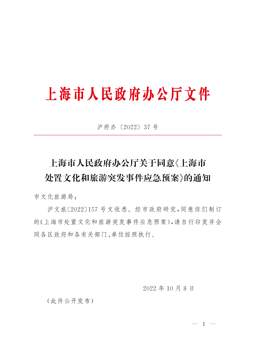 ??滬文旅〔2022〕157號文收悉。經市政府研究,同意你們制訂的《上海市處置文化和旅游突發(fā)事件應急預案》,請自行印發(fā)并會同各區(qū)政府和各有關部門、單位按照執(zhí)行。
