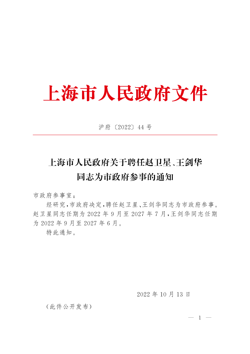 上海市人民政府關(guān)于聘任趙衛(wèi)星、王劍華同志為市政府參事的通知