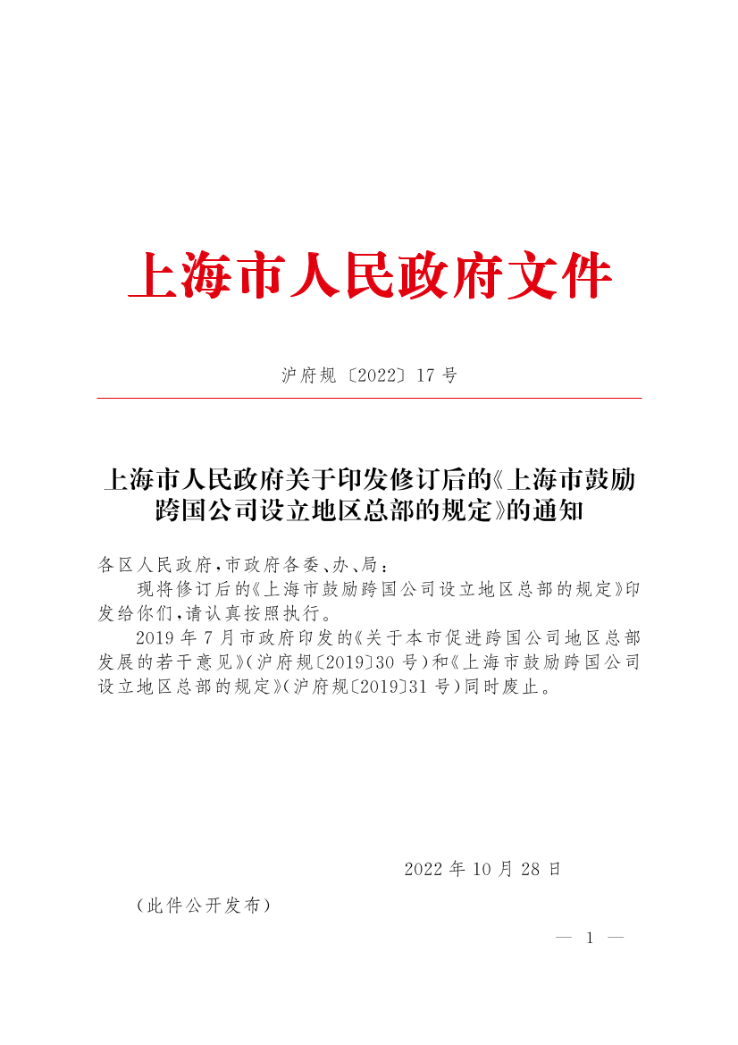 上海市人民政府關(guān)于印發(fā)修訂后的《上海市鼓勵(lì)跨國(guó)公司設(shè)立地區(qū)總部的規(guī)定》的通知