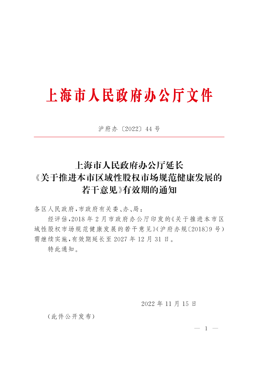 上海市人民政府辦公廳延長《關(guān)于推進本市區(qū)域性股權(quán)市場規(guī)范健康發(fā)展的若干意見》有效期的通知