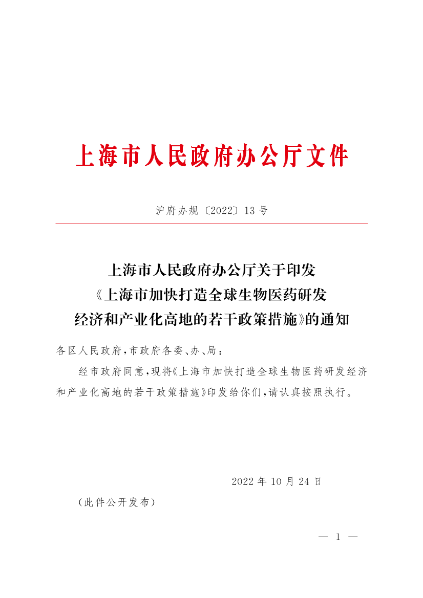 ??經(jīng)市政府同意,現(xiàn)將《上海市加快打造全球生物醫(yī)藥研發(fā)經(jīng)濟和產(chǎn)業(yè)化高地的若干政策措施》印發(fā)給你們,請認真按照執(zhí)行。