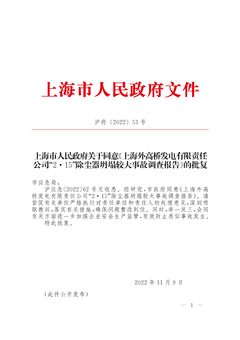 ??滬應(yīng)急〔2022〕62號(hào)文收悉。經(jīng)研究,市政府同意《上海外高橋發(fā)電有限責(zé)任公司“2·15”除塵器坍塌較大事故調(diào)查報(bào)告》。請(qǐng)督促有關(guān)單位嚴(yán)格執(zhí)行對(duì)責(zé)任單位和責(zé)任人的處理意見,深刻吸取教訓(xùn),落實(shí)有關(guān)措施,確保問題整改到位。同時(shí),舉一反三,會(huì)同有關(guān)方面進(jìn)一步加強(qiáng)企業(yè)安全生產(chǎn)監(jiān)管,有效防止類似事故發(fā)生。