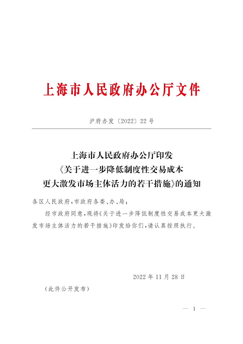 上海市人民政府辦公廳印發(fā)《關(guān)于進一步降低制度性交易成本更大激發(fā)市場主體活力的若干措施》的通知