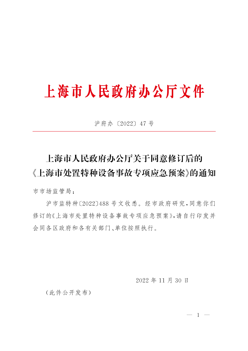 ??滬市監(jiān)特種〔2022〕488號文收悉。經(jīng)市政府研究,同意你們修訂的《上海市處置特種設(shè)備事故專項(xiàng)應(yīng)急預(yù)案》,請自行印發(fā)并會同各區(qū)政府和各有關(guān)部門、單位按照執(zhí)行。