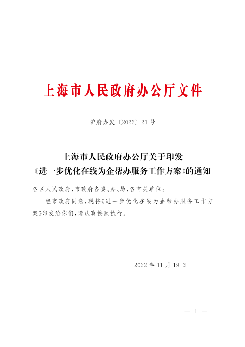 上海市人民政府辦公廳關(guān)于印發(fā)《進(jìn)一步優(yōu)化在線為企幫辦服務(wù)工作方案》的通知